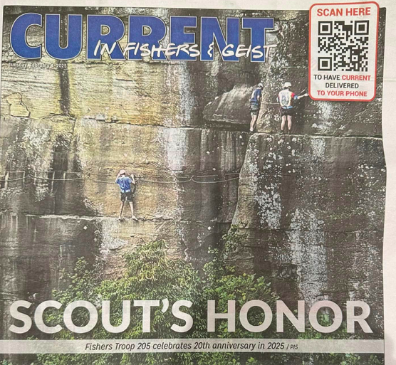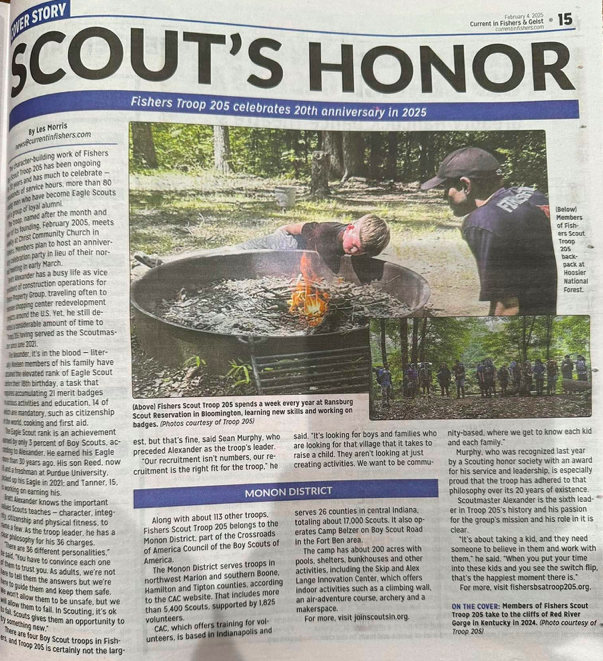 In February, Troop 205 celebrated our 20th Anniversary of Scouting. We had a great turnout of former 205’er Scouts, Leaders, and Families. We were featured in the Current in Fishers Magazine!